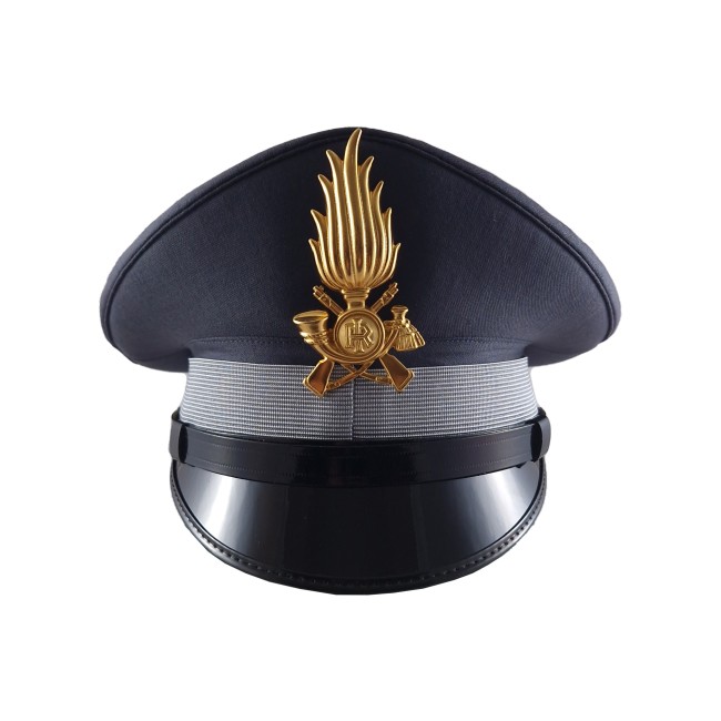 Berretto maschile da Truppa (Finanziere, Finanziere Scelto, Appuntato, Appuntato Scelto) della Guardia di Finanza marca Diadema modello 45/70, completo di fiamma e soggolo già applicati e pronto per essere indossato.