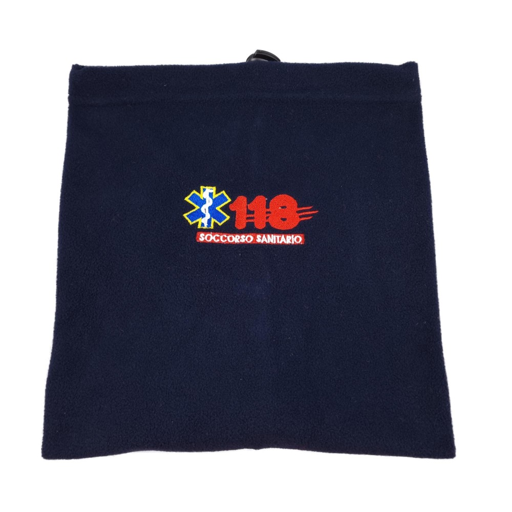 Scaldacollo del 118 in pile blu con logo ricamato, regolabile in larghezza con l'apposito elastico.