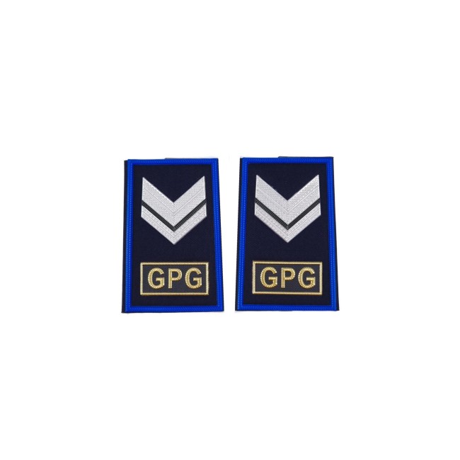 Coppia di gradi tubolari da Vicebrigadiere da Guardia Particolare Giurata (GPG). Realizzati in plastica con scritta gpg termosaldata e bordo blu.